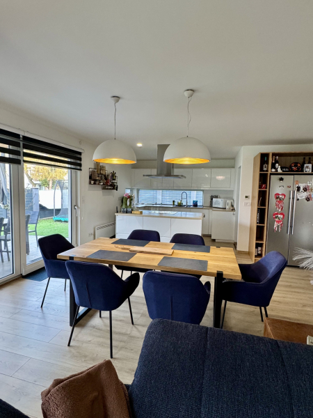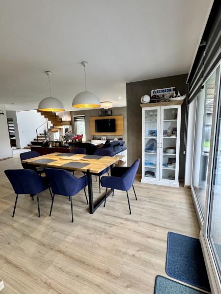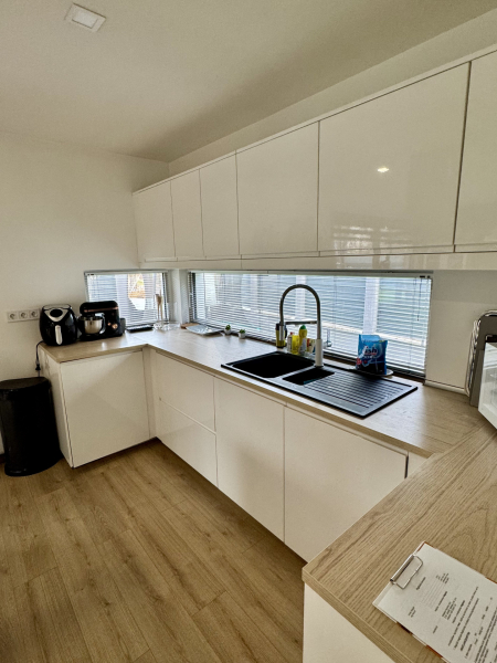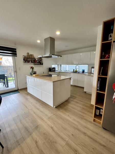 o Tágas amerikai konyhás nappali étkezővel, világos terek és közvetlen kertkapcsolat.
