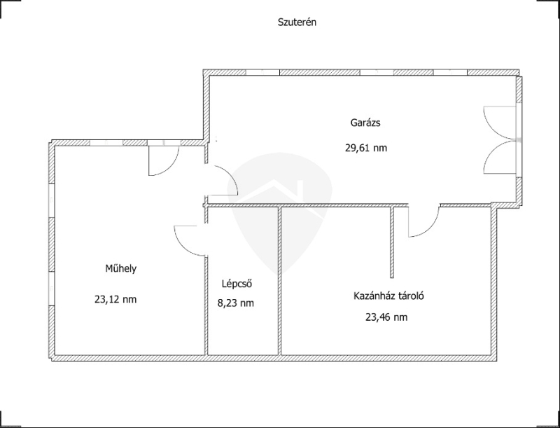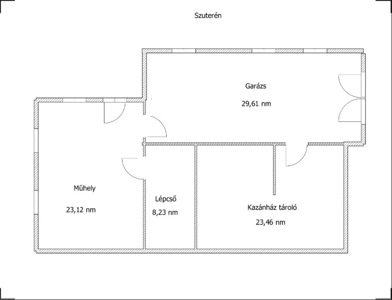 Szuterén szint: 84 nm, benne garázs, műhely, tároló és kazánház