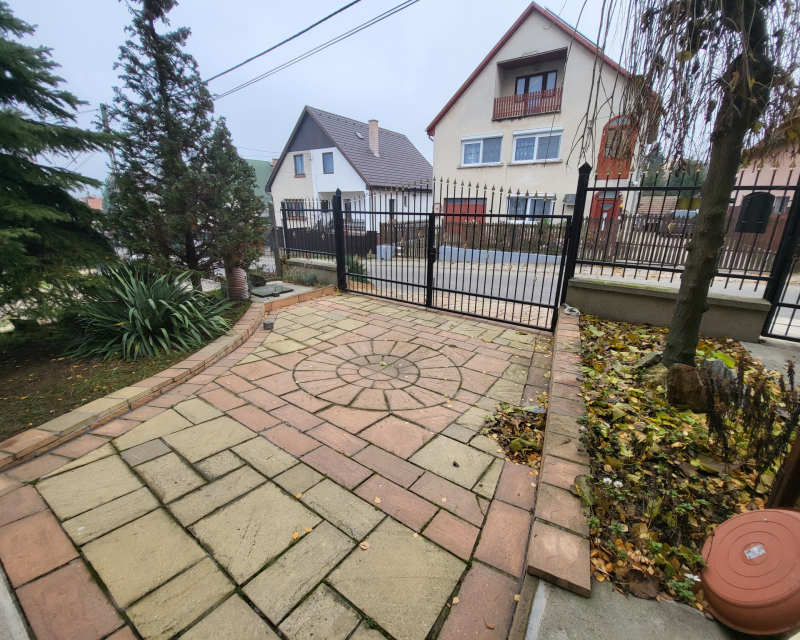 A ház utcafronti részén kialakításra került egy zárható, fedett garázs és további egy autó részére, egy nem fedett kerítésen belüli parkoló is.