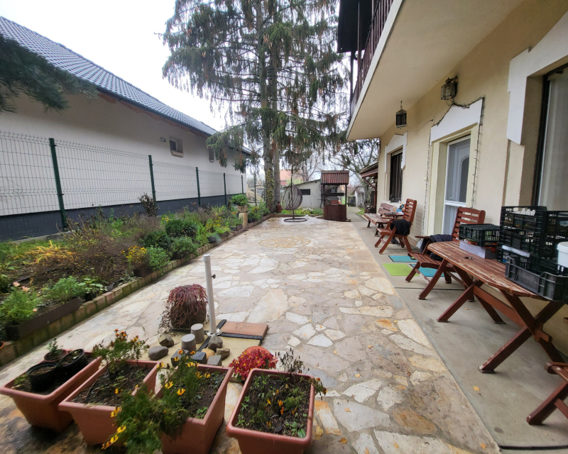 Telek mérete 1399 m2, amely rendkívül rendezett, helyet kapott benne egy gyümölcsös, egy üvegház, 1 db gyűrűs kút, 1 db fúrt kút, 1 db 4700 literes esővíz gyűjtő. A tökéletes kerti pihenést, kikapcsolódást biztosító részeken, kiépített locsoló rendszer dolgozik a tulajdonosok helyett. Kinti épületek (amelyek térképészeten is megtalálhatóak) nyári konyha, hobbi szerszámos kamra, sufni. Hiba lenne figyelmen kívül hagyni a pinceszint alatt kialakított, tágas borospincét.