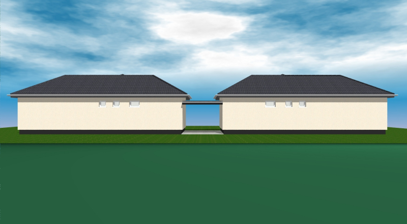 A házakat fedett gépkocsibeállóval kötik össze, így nincs közös fal.