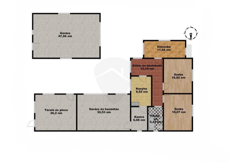 Az ingatlanhoz két tágas garázs tartozik (30 m² és 47 m²), valamint több melléképület is: kazánház, 26 m²-es tároló, ólak és gazdasági épületek, így azok számára is remek lehetőség, akik kisebb gazdaságot szeretnének fenntartani. A ház alatt pince is található, az udvar füvesített, fákkal ültetett, és saját kúttal is rendelkezik.