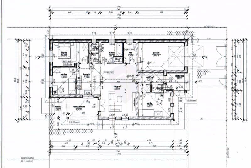 Az ingatlan lakütere 101 négyzetméter melyhez tartozik egy 21 négyzetméteres garázs közvetlen bejárattal az ingatlanba, valamint előterasz fedett terasz és terasz is.