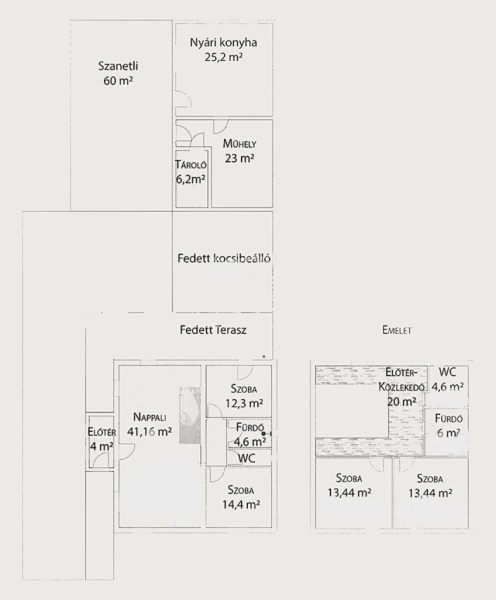 Melléképület: 57 m² – nyári konyha gépesített konyhabútorral, műhely, WC