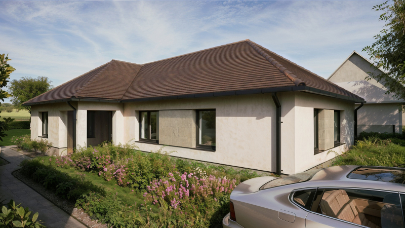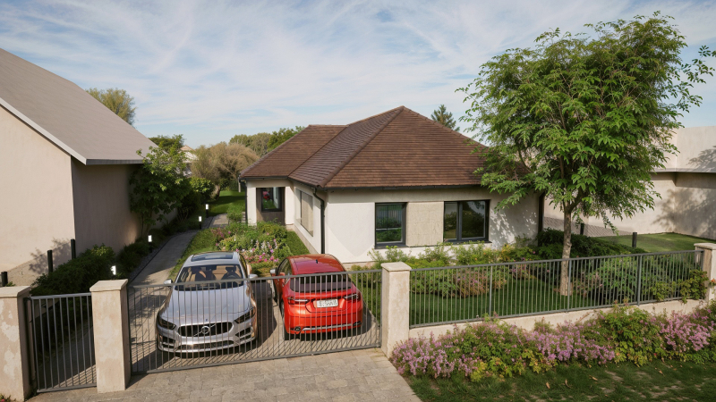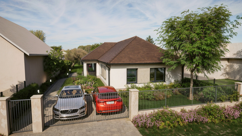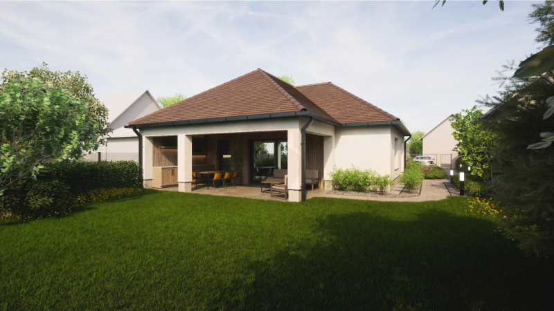 A ház energiatakarékos kivitelezésben épül, korszerű hőszivattyús fűtéssel, padlófűtéssel.