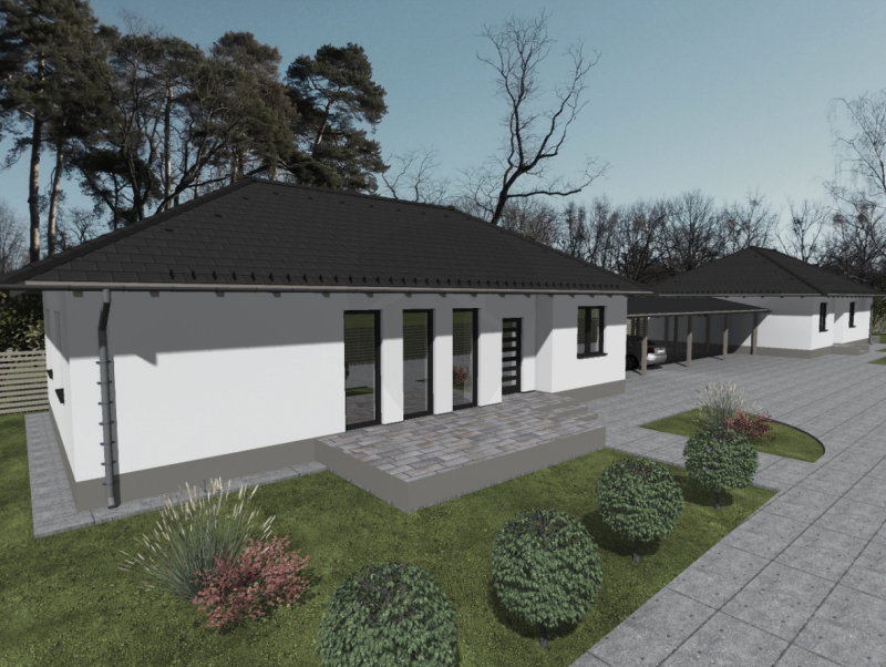 A házakat fedett gépkocsibeállóval kötik össze, így nincs közös fal.